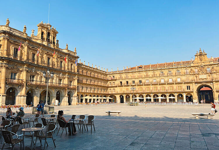 - La Plaza Mayor, uno de los lugares más emblemáticos de la ciudad, donde se respira la esencia de la vida salmantina.